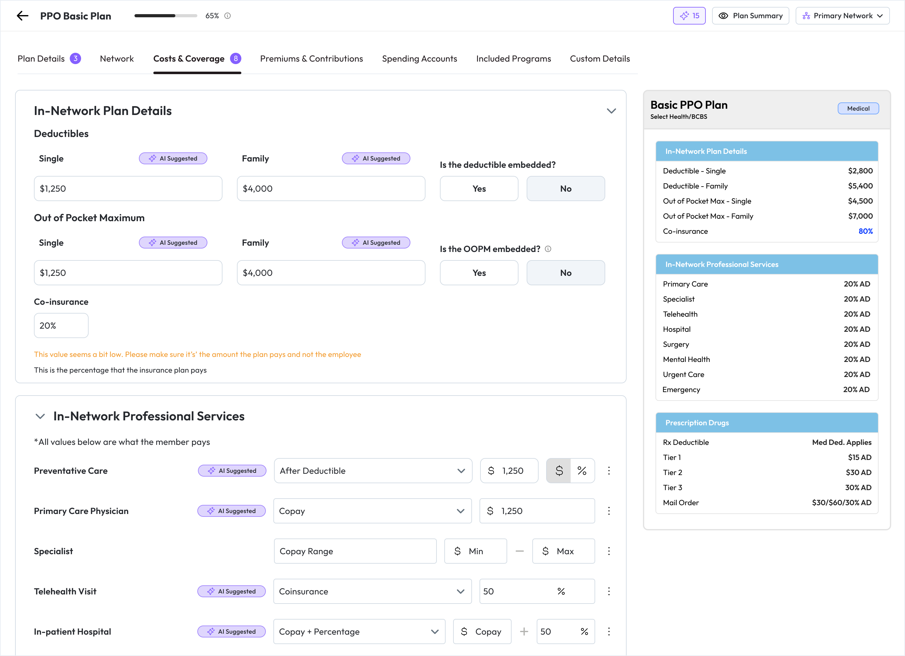 • Say goodbye to endless scrolling. The product form now uses tabs for quick navigation, with the employee-facing plan summary broken into smaller, relevant previews. When using the “smart import” feature, each field identified by our AI importer will be highlighted with an “AI Suggestion” pill. Click on this to accept or reject the value.