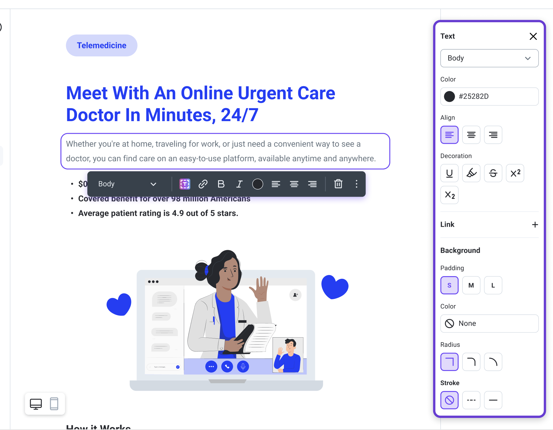 The inline properties toolbar now adapts to display the most frequently used features when interacting with text.